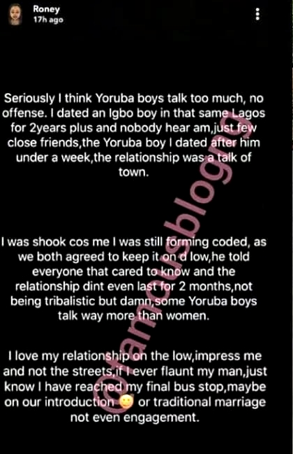 "I was shook cos me I was still forming coded, as we both agreed to keep it on d low, he told everyone that cared to know and the relationship did not even last for 2 months, not being tribalistic but some Yoruba boys talk way more than women.