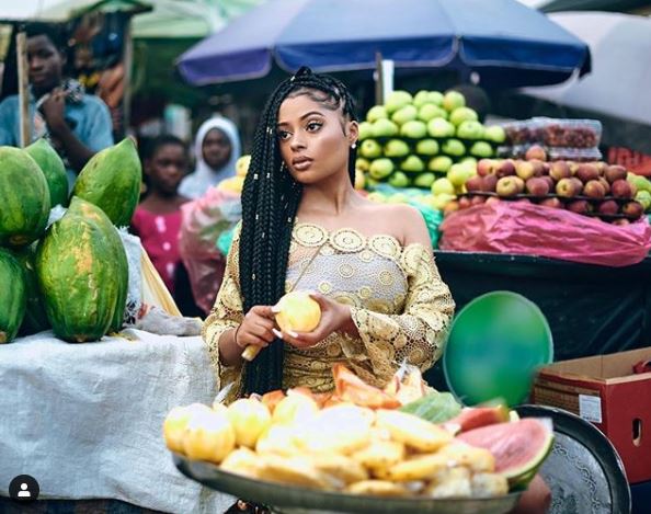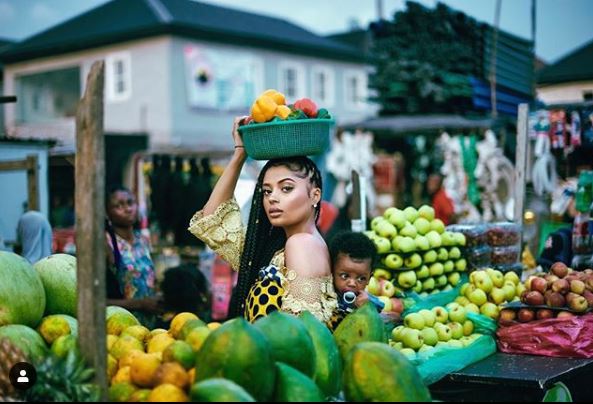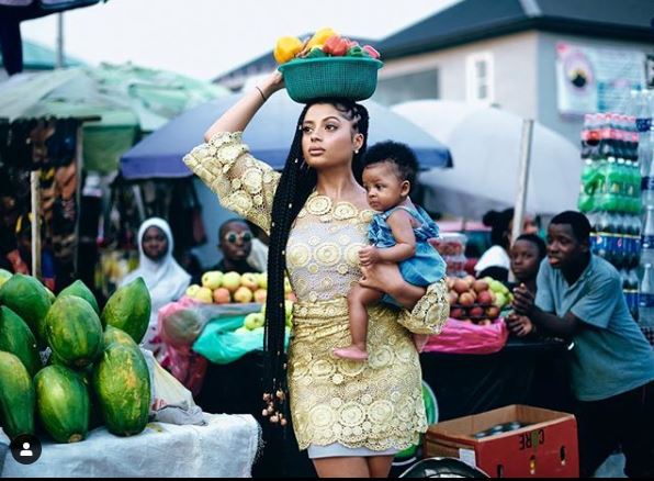 To celebrate her birthday, Lola posted some new photos on her Instagram page. She is seen in the photos posing with her baby whom she had with pop star, Tekno. In one photo, the baby is strapped to her back as they take a walk through a market place.